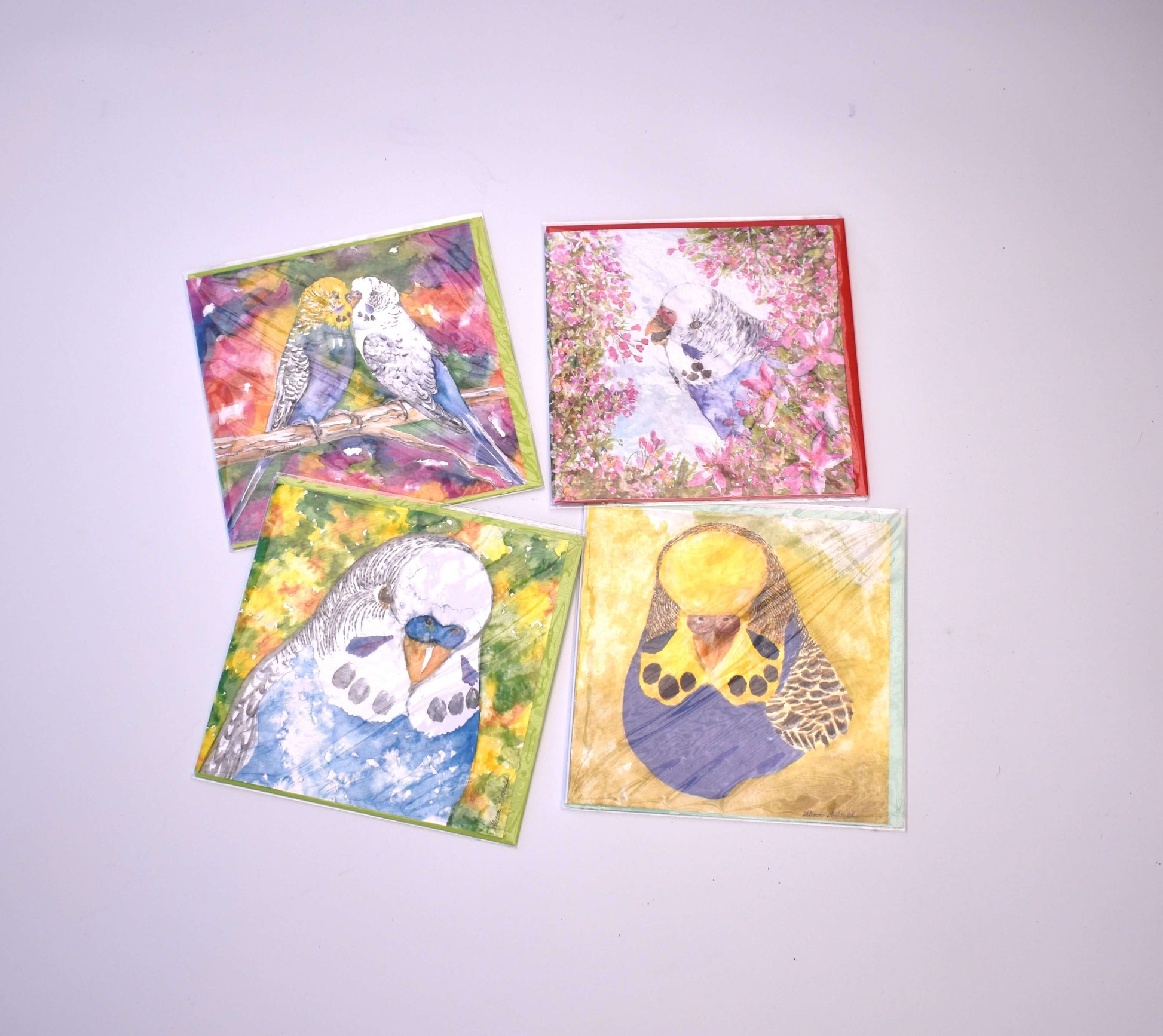 4 x original budgie greeting cards with full colour blank inside, & complimentary envelope (please note greeting card designs will vary, as they will be a random selection of 4 from our range of 12 budgie designs)