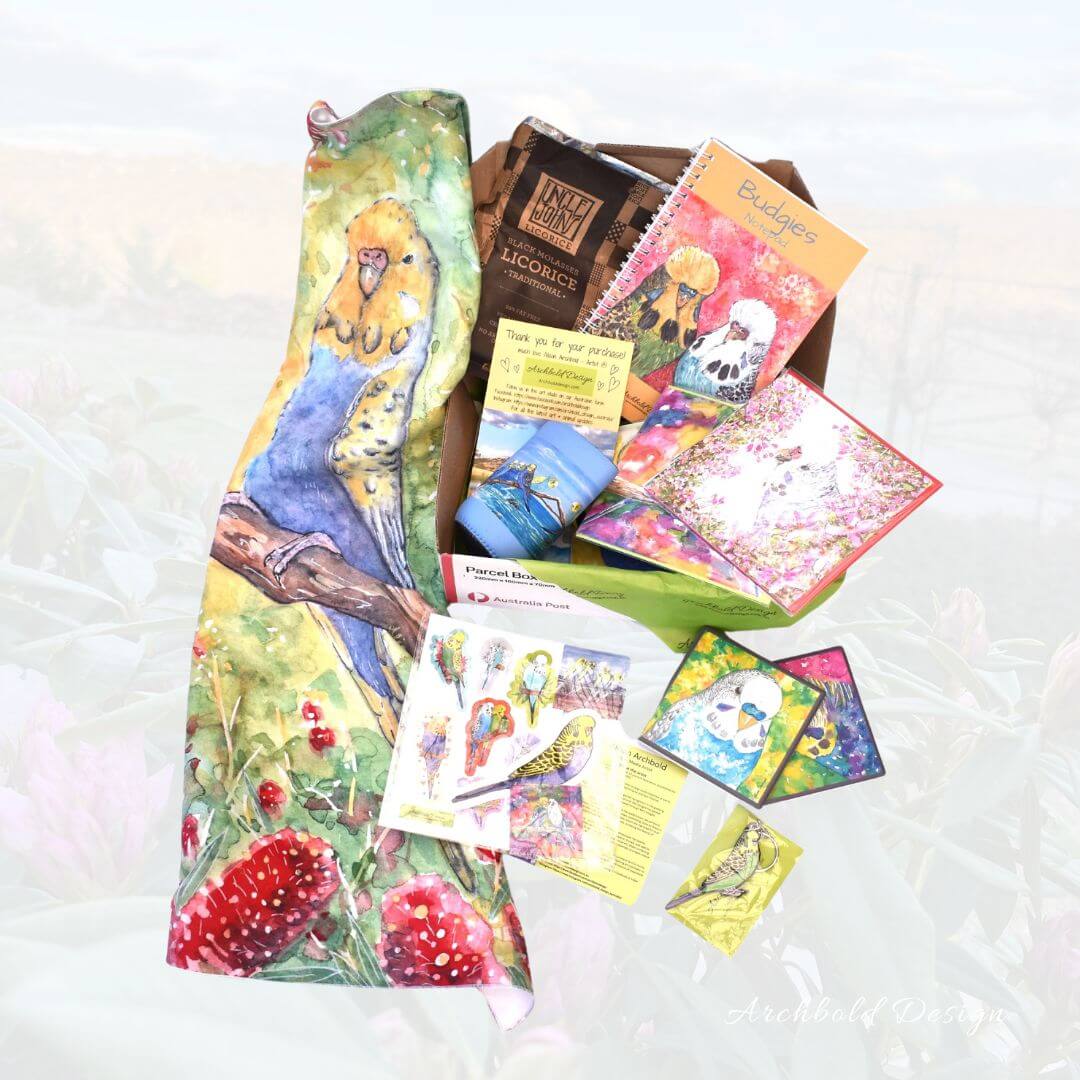 Our beautiful Budgie Gift Boxes are filled with an assortment of original budgie inspired products, all designed & created by Alison. These make a fantastic & unique gift for any Budgie lover!